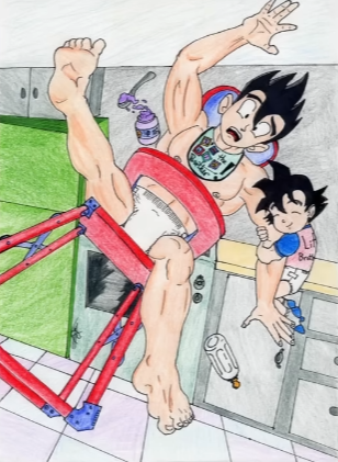 恐らく悟飯と悟天が描かれた画像ですが、子供用の椅子に座った悟飯が転倒してしまっているというイラストです。